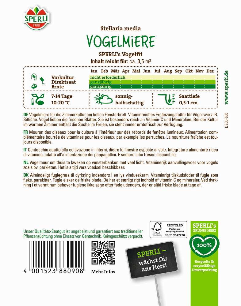 SPERLI's Vogelfit ist eine begehrtes Grünfutter für alle Ziervögel und Heimtiervogelarten. Nur in Kästen oder Töpfen aussehen, da sich die Pflanzen leicht versamen und dann schwer aus Beetn zu entfernen sind.