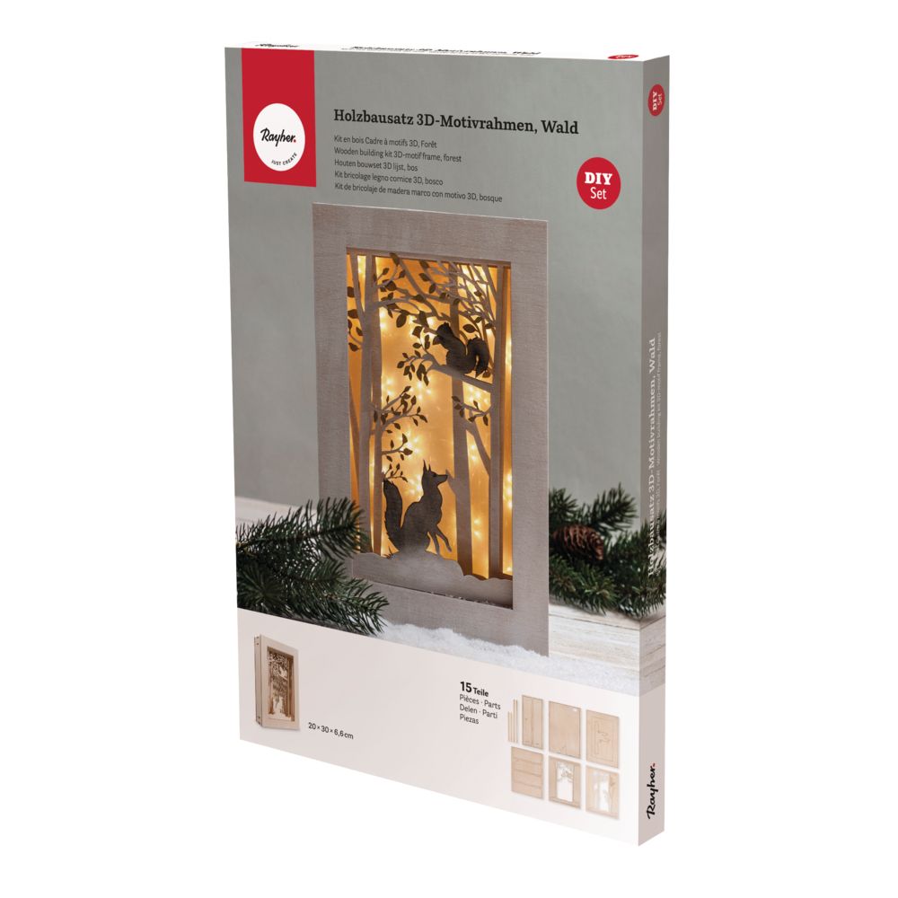 Der gelaserte 15-teilige Bausatz, aus 3 mm starkem Holz, kann mit Hilfe eines Bastelmessers ganz einfach an den Verbindungsstegen aus den Holzplatten herausgelöst werden. Anhand der detaillierten und nummerierten Anleitung kannst du die Holzteile anschließend schnell und einfach zusammenstecken und zu einem raffinierten Rahmen mit Waldmotiv und eindrucksvoller 3D-Optik in der Größe 20x30x6,5 cm zusammenstecken.