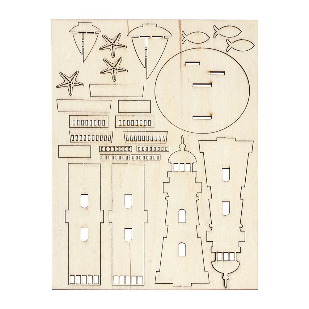 Inhalt: 25-teiliger Holz-Bausatz für 1 Leuchtturm, 14cm hoch, 2 Segelboote, 3 Seesterne, 3 Fische. Zusätzlich benötigst du: Bastelmesser, Klebstoff und nach Wunsch Farben, Flitter oder Glitter- Glue. Durchmesser der Bodenplatte 8,2 cm.