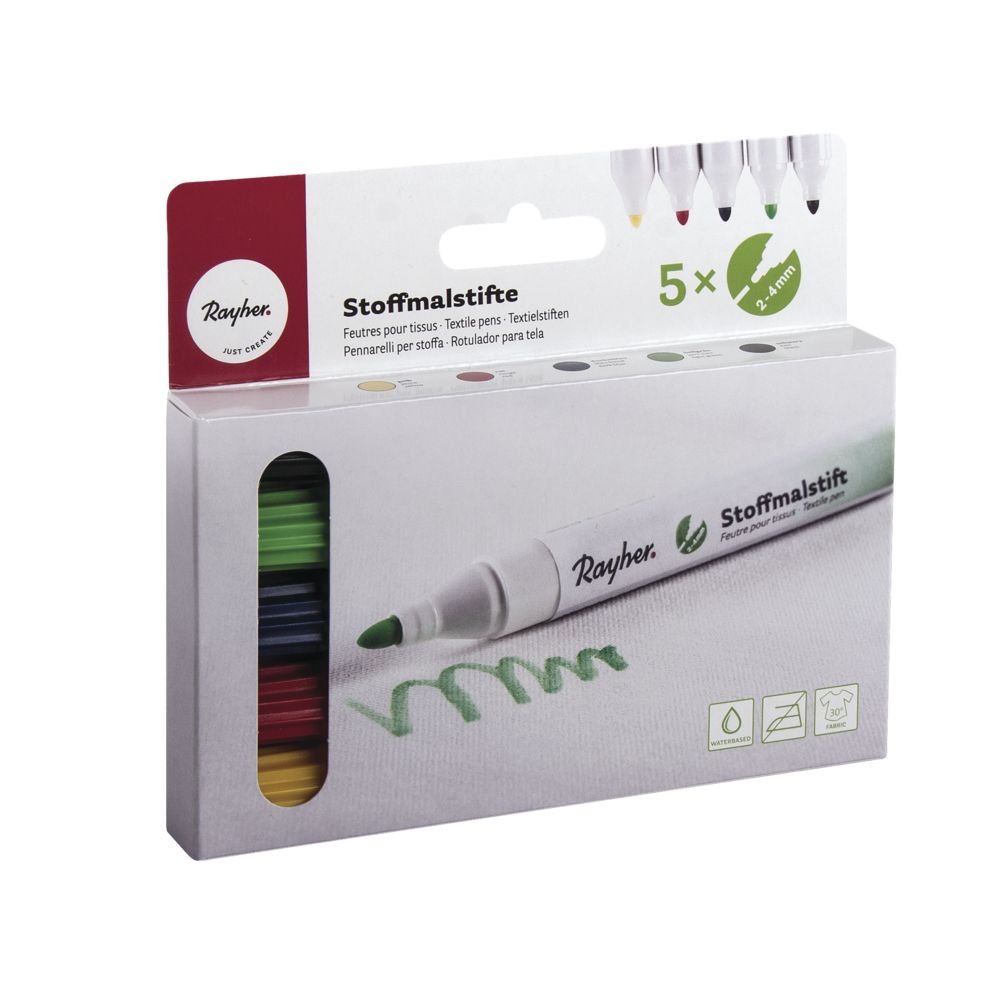 5 Stoffmalstifte mit dicker Rundspitze, 2-4mm, in den Farben Gelb, Rot, Dunkelblau, Hellgrün, Schwarz