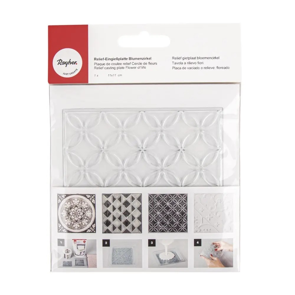Verleihe selbst gegossenen Fliesen und anderen Gießobjekten einen eleganten, plastischen Look mit einem raffinierten Relief in Blumenzirkel-Optik. Die Reliefplatte kann beidseitig verwendet werden. Schlichte Gießobjekte und Fliesen aus Raysin-Gießpulver oder Kreativ- Beton werden dank außergewöhnlichen, plastischem Relief zum kreativen Unikat.