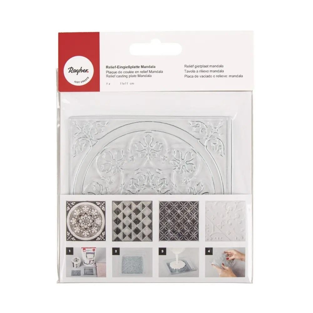 Die wiederverwendbare Relief-Eingießplatte in Größe 11x11 cm und Mandala-Muster besteht aus festem, stabilen PET. Die Reliefplatte wird vor dem Gießen in die gewünschte Gießform eingelegt, anschließend mit der Gießmasse übergossen und nach dem Trocknen des Objekts wieder mit der Pinzette herausgehoben.