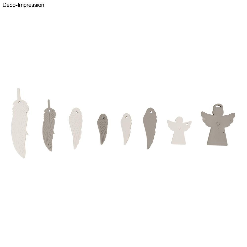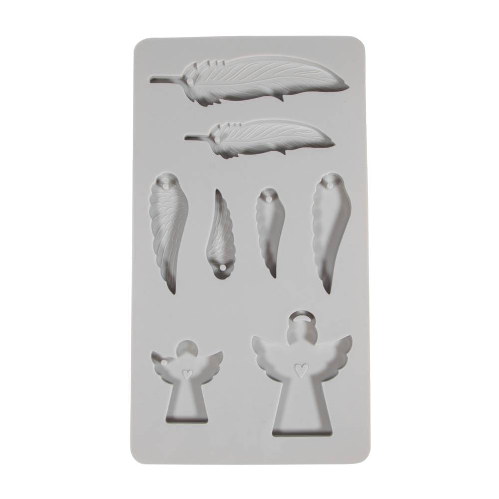 Silikon-Gießform 26 x 14,5 x 1 cm, 8 verschiedene Motive. Maße der Motive: Engel groß 7,5 x 6 cm, Engel klein 5 x 4,5 cm, Flügel groß 7,5 x 2,5 cm, Flügel klein 5,5 x 1,8 cm, Federn groß 12,5 x 3 cm, Federn klein 9,3 x 2 cm, Tiefe jeweils 8 mm.