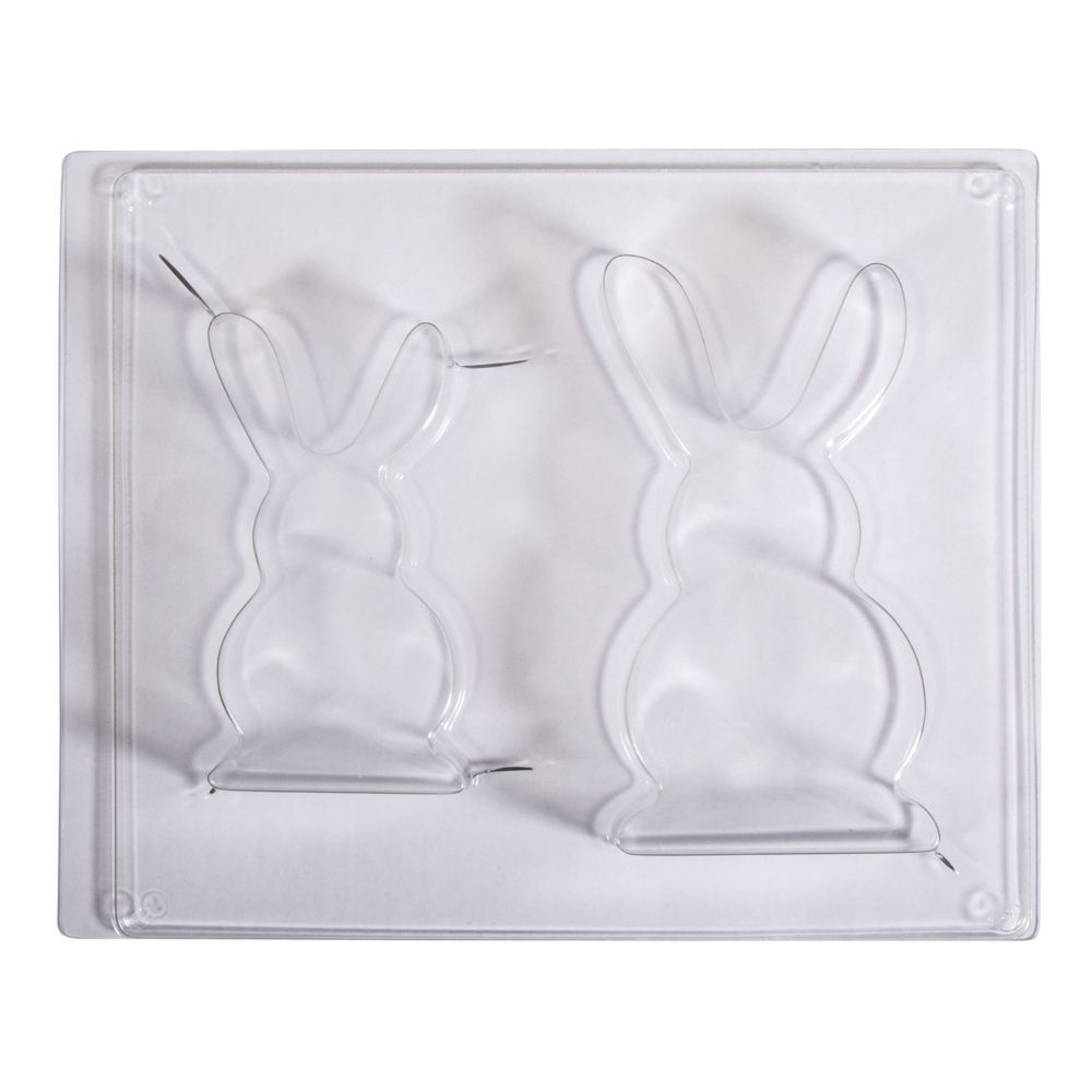 Die Gießform aus hochwertigem, transparentem PET ist formstabil und beinhaltet zwei Hasenmotive in der Größe 8x14,5 cm und 6,5x11,7 cm, mit einer Motivtiefe von 3 cm.