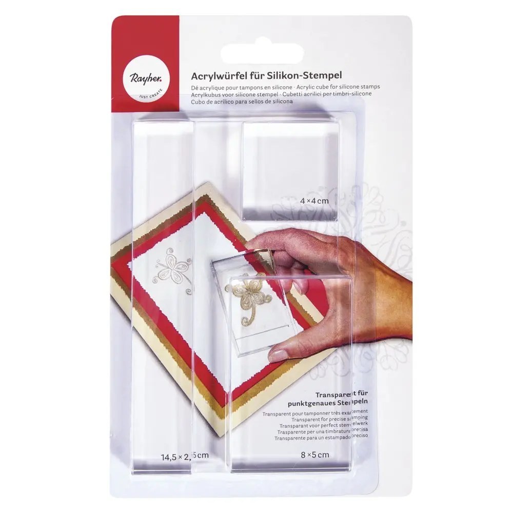 Diese Stempelblocks sind in Kombination mit Silikonstempel zu verwenden und dienen als handlicher Träger der Silikonstempel. 4x4x1 cm, 14,5 x 2,5 x 1 cm, 5 x 8 x 1 cm. Der längliche Acrylblock ist zum Beispiel hervorragend für Silikonbuchstaben geeignet.