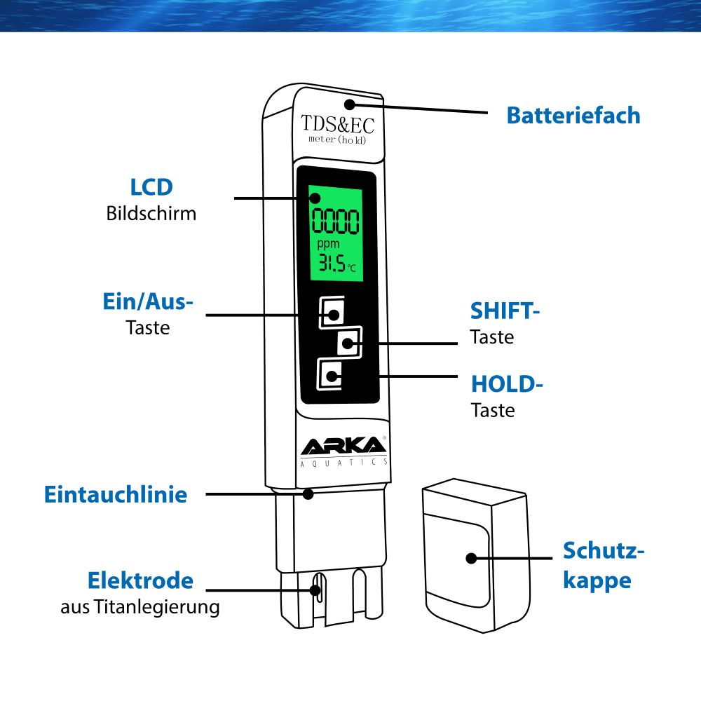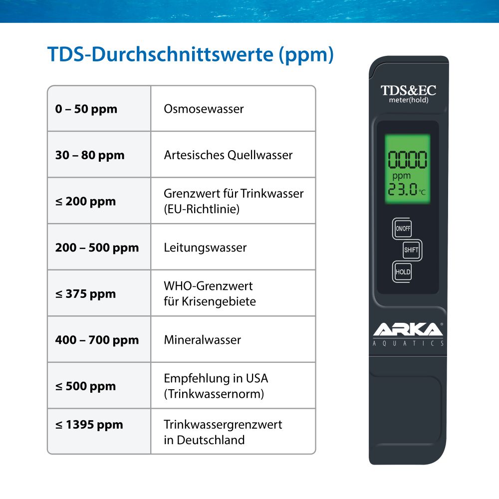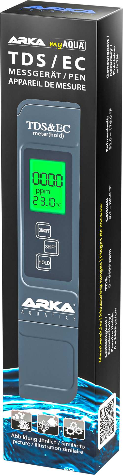 ARKA myAQUA TDS/EC Messgerät ermöglicht eine schnelle und genaue Bestimmung der Anzahl an gelösten Stoffen (TDS), der elektrischen Leitfähigkeit (EC) sowie der Temperatur von Wasser.