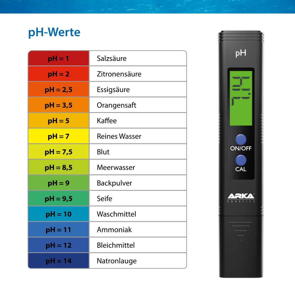 ARKA myAQUA® pH-Messgerät ermöglicht eine schnelle und genaue Bestimmung des pH-Werts von Wasser und weiteren Flüssigkeiten. Es eignet sich optimal zur Verwendung in jedem Aquarium, Teich, Pool sowie für Osmose- und Trinkwasser.