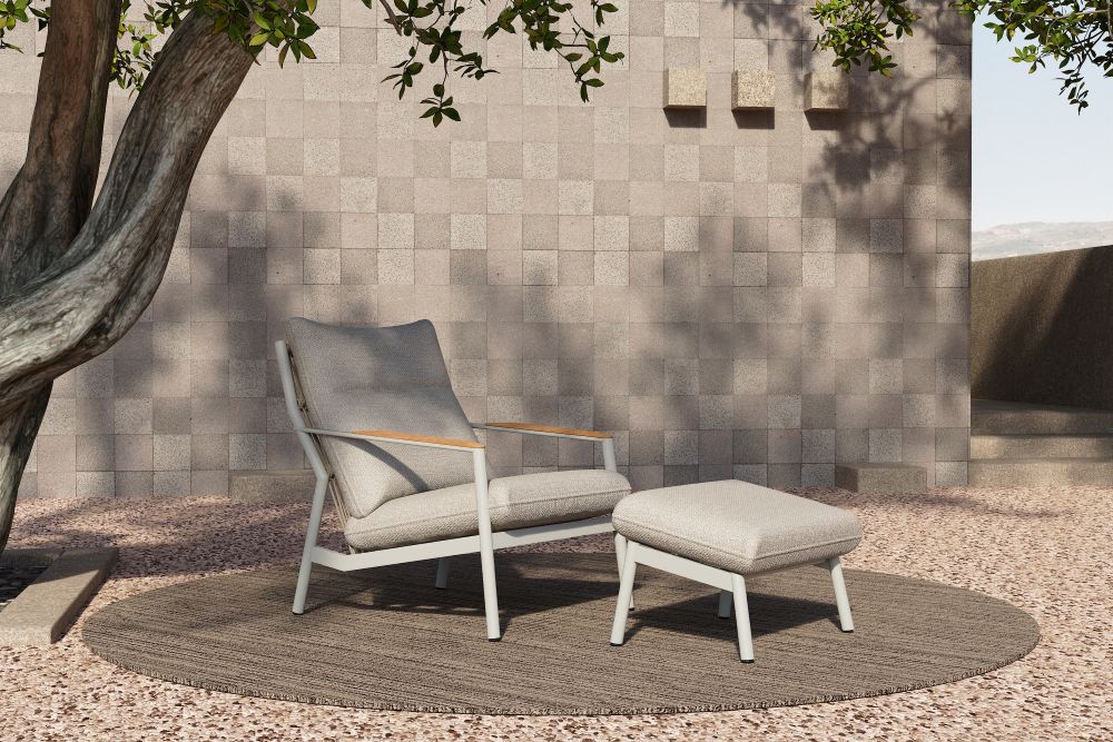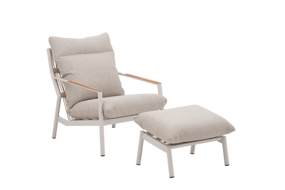 - Material: Aluminium, Rope, cremefarbene Kissen, Teakholz- Armlehnen