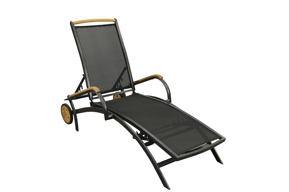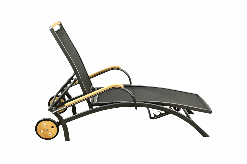 Diese Sonnenliege besteht aus einem Gestell aus Aluminium und einer Bespannung aus Textilen, die Armlehnen bestehen aus Teakholz. Die Materialien sind Pflegeleicht, rostfrei und wetterbeständig, bei Teakholz gehören Graufärbungen und auch eine Rissbildung im Holz zu den natürlichen Eigenschaften. Außerdem nehmen die Armlehnen aus Teakholz kaum Wärme auf und haben dadurch immer eine angenehme Temperatur. Die Rückenlehne und auch Liegfläche kann in 4 verschiedene Positionen gestellt werden. Des weiterem kann die Liege schnell und einfach durch ihre Rollen verschoben werden. Zusätzlich können Sie Ihre Möbel mit der passenden atmungsaktiven Schutzhülle von Aerocover vor Witterungseinflüssen schützen. Die Maße der Liege: L 189 x B 53 x H 36 cm.