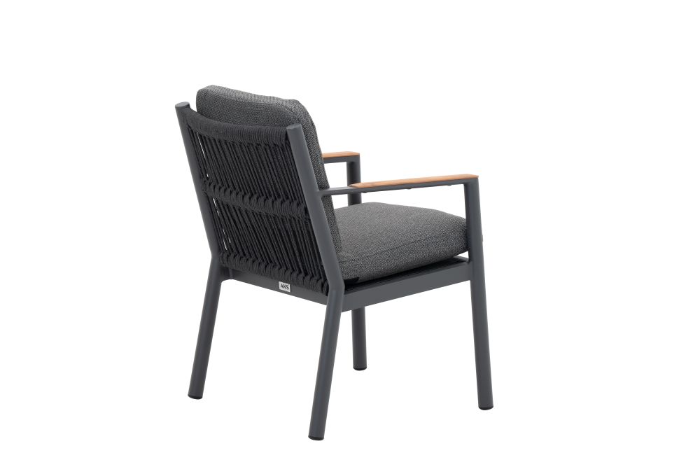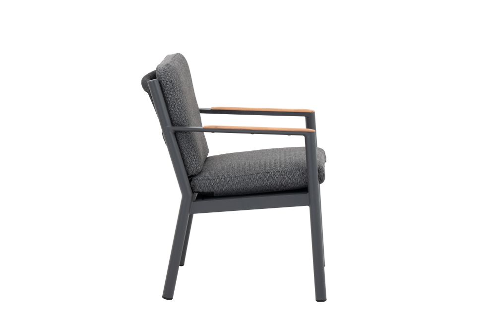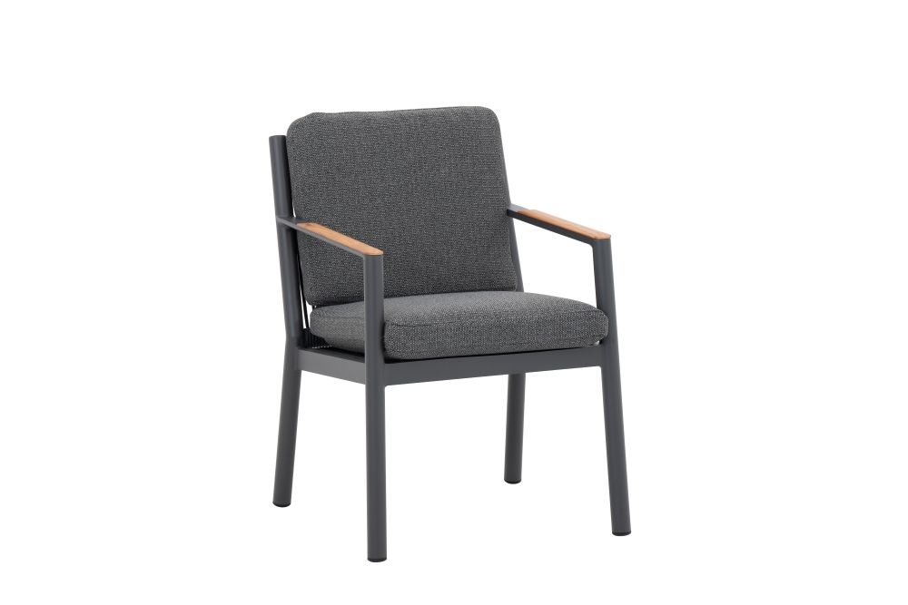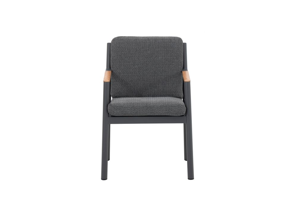 Komfortabler Sessel mit Teakarmlehnen. Für jeden Essbereich - Egal ob im Garten, Balkon oder Terrasse.