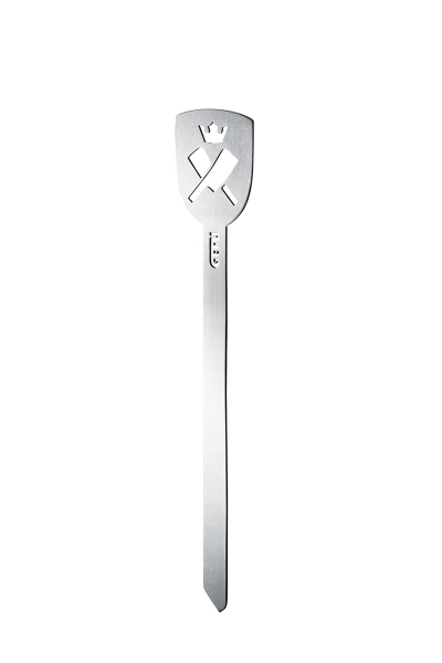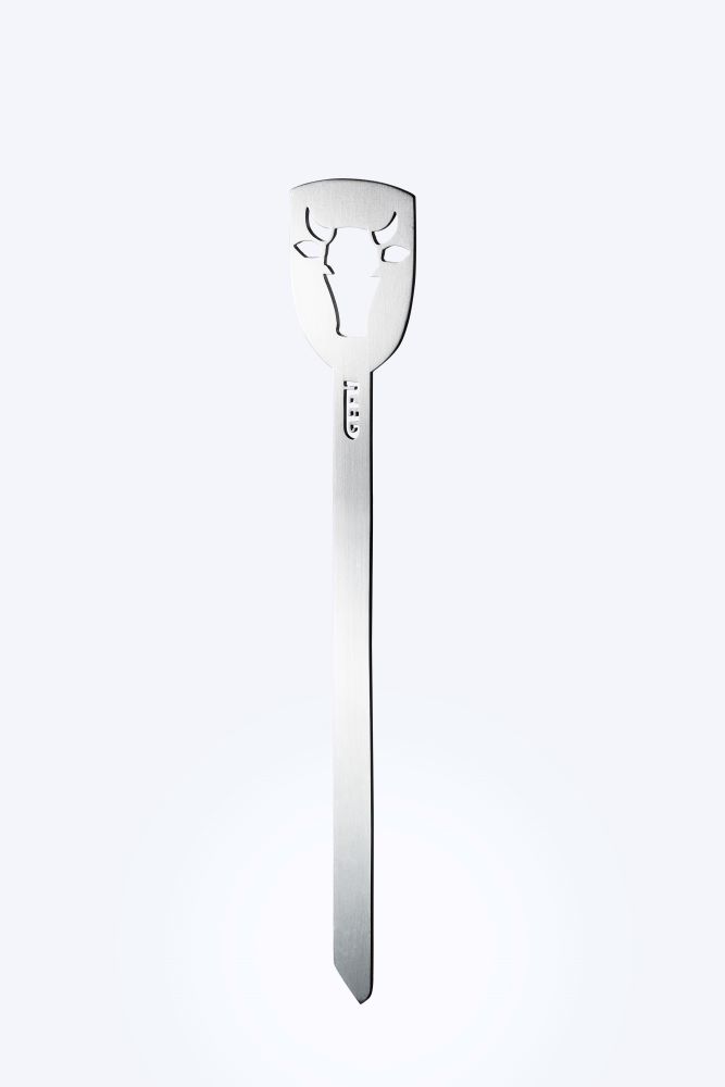 - zum Fixieren von Hamburgern - für Grillspieße mit und ohne Fleisch - Motive: Stier + Fleischerbeil - L 19,0 cm, B 3,3 cm, H 0,2 cm - hochwertiger Edelstahl