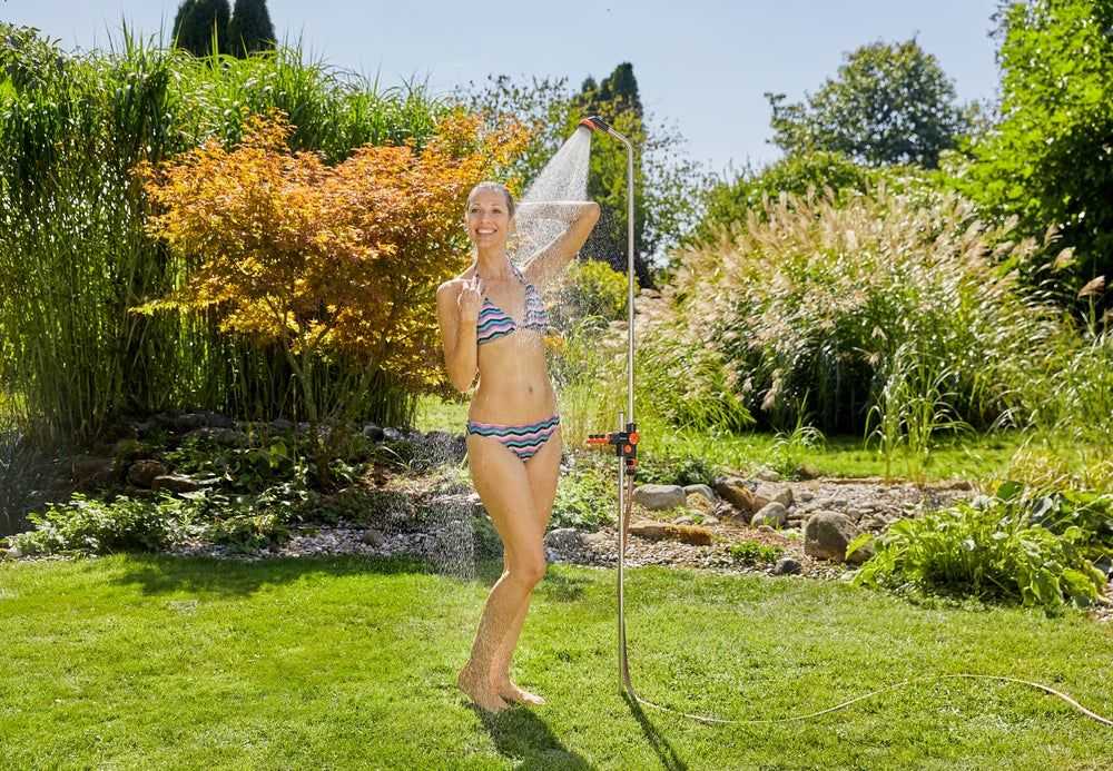 So macht Duschen im Freien richtig Spaß! Durch den Spike kann die GARDENA Gartendusche duo einfach in den Rasen oder in den Sonnenschirmständer gesteckt werden. Zwei Strahlformen stehen zur Auswahl: entweder ein weicher und breit gefächerter Brausestrahl oder der fein einstellbare Sprühnebel für eine ganz besondere Erfrischung. Die stufenlose Höhenverstellung durch den Druckknopf bietet die ideale Fixierung der Brause für jede Körpergröße. Das Regulier- und Absperrventil zur Mengenregulierung gibt die gewünschte Wassermenge frei.