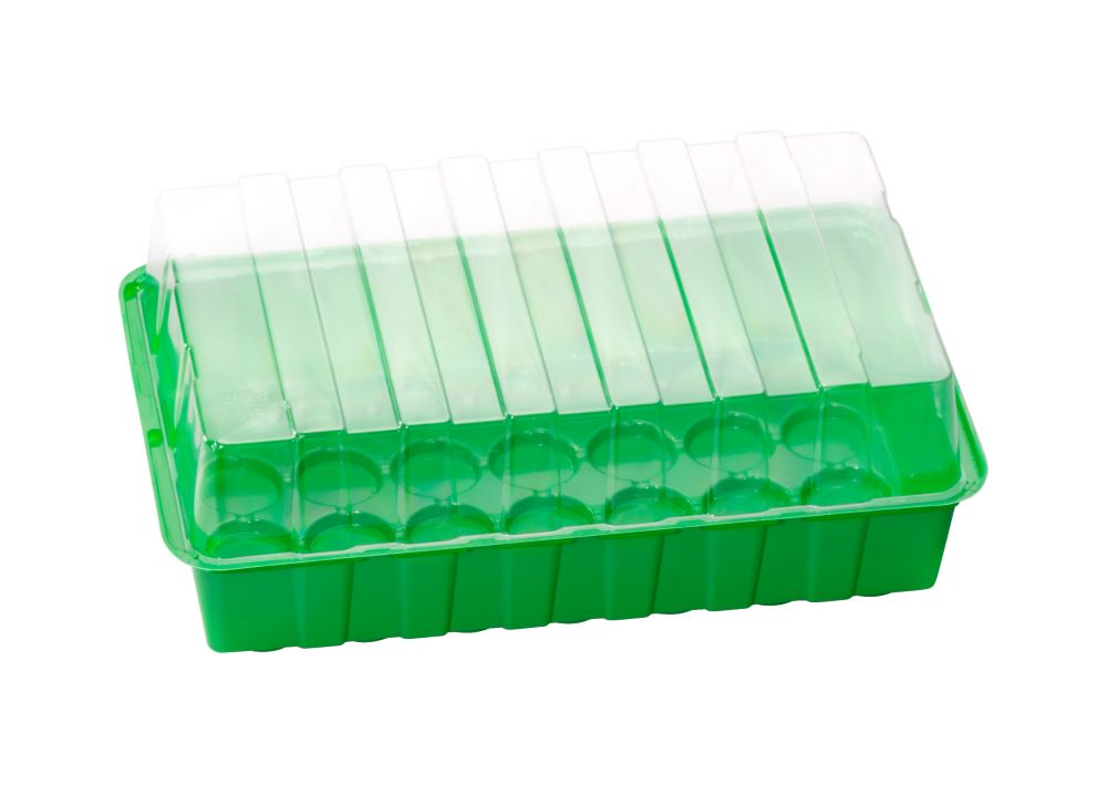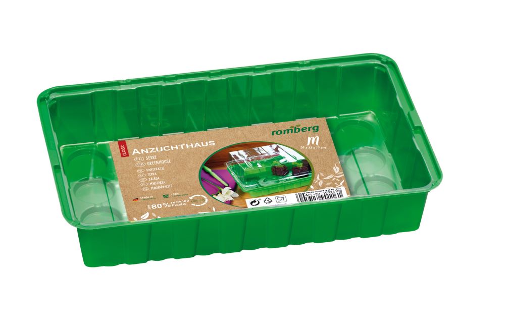Anzuchthäuser von Romberg sind aus PAK-freiem Kunststoff und lebensmittelecht. Sie ermöglichen beste Anzuchtergebnisse durch Belüftungsschlitze für die Zwangsventilation und Rinnen zur optimalen Wasserverteilung. Zudem läuft das Kondenswasser vom Deckel zurück in die Schale und nicht auf die Fensterbank. Perfekt in Kombination mit Romberg Kokos-Quelltabletten oder Anzuchttöpfen. Mit den Romberg Anzuchthäusern kann jeder Zuhause Kräuter, Blumen und Gemüse anziehen: einfach das gewählte Anzuchthaus mit Romberg Quelltabletten oder Anzuchttöpfen plus Substrat füllen. Anschließend Samen oder Setzlinge nach den jeweiligen pflanzenspezifischen Anforderungen in das Substrat einsetzen. Für eine gute Substratdurchfeuchtung sorgen und Haube aufsetzen. Regelmäßiges Lüften und Bewässern nicht vergessen. Bei Bedarf für zusätzliche Wärme und Beleuchtung sorgen. Das besondere Umwelt PLUS: Schale und Haube sind aus 80 % reyceltem Kunststoff!