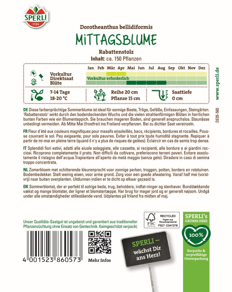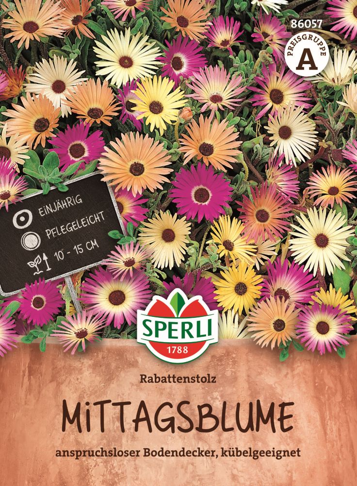 Die Mittagsblume 'Rabattenstolz' von SPERLI ist eine farbenfrohe Sommerblume, welche Du in Steingärten, Beete, Einfassungen, Tröge und Gefäße aussäen kannst. Dort wachsen die einjährigen Pflanzen ca. 10 bis 15 cm hoch und bilden einen herrlich leuchtenden, bodendeckenden Blumenteppich.