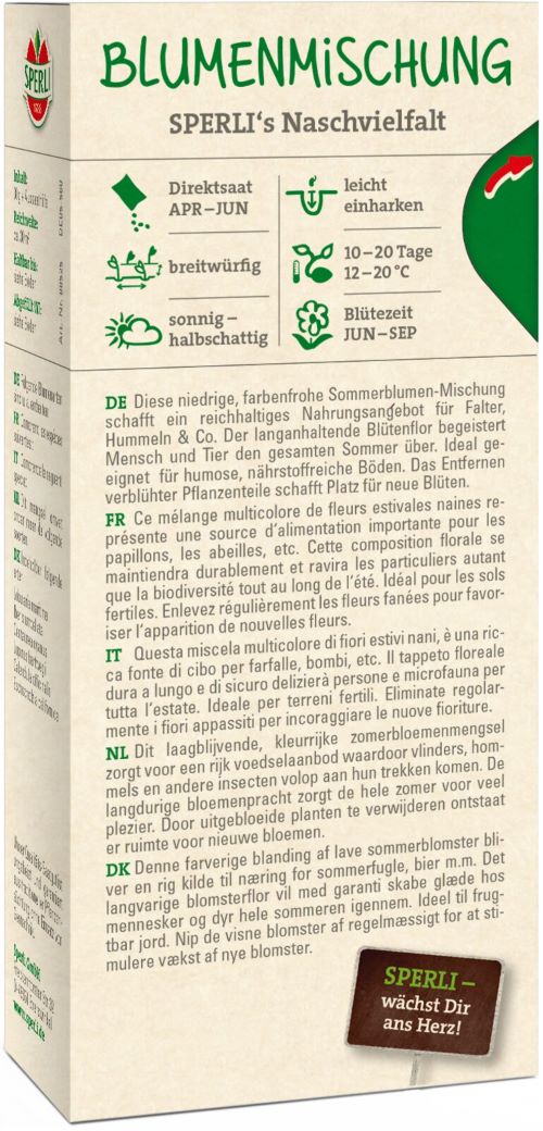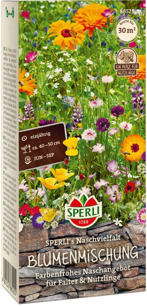 Diese farbenfrohe Blumenmischung trägt den Namen "SPERLI's Naschvielfalt" nicht ohne Grund: Die Sommerblumen sind sehr nützlingsfreundlich und erschaffen ein farbenfrohes Naschangebot für Falter und andere Insekten. So kann sich nicht nur der Mensch von Juni bis September an der Blumenvielfalt erfreuen, sondern zusätzlich eine kleine Nützlingsoase schaffen.