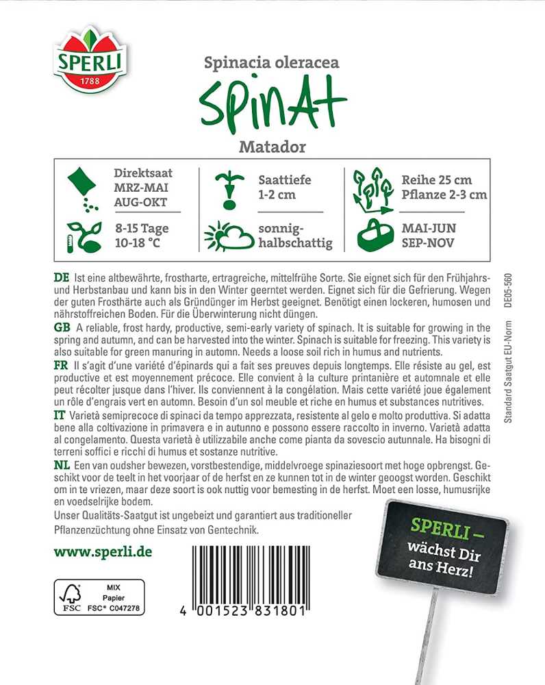 Herstellerinformation zu "Sperli Spinatsamen Matador, MaxiPack 50g"