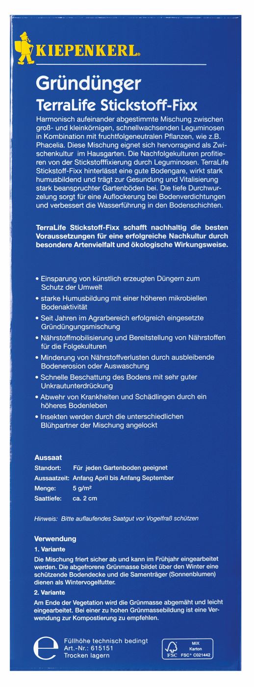 Schnelle Bodenbedeckung und Stickstoffbindung. Harmonisch aufeinander abgestimmte Mischung, die durch die hohe Stickstoffbindung eine ideale Zwischenfruchtmischung für Kulturen im Nachfolgejahr mit sich zieht. Die sicher abfrierende Mischung hinterlässt eine sehr gute Bodengare, wirkt stark humusbildend und trägt zur Gesundung und Vitalisierung stark beanspruchter Gartenböden (z. B. enge Fruchtfolgen) bei. Die tiefe Durchwurzelung sorgt für eine Auflockerung bei Bodenverdichtungen und sorgt somit für eine gute Bodenstruktur.