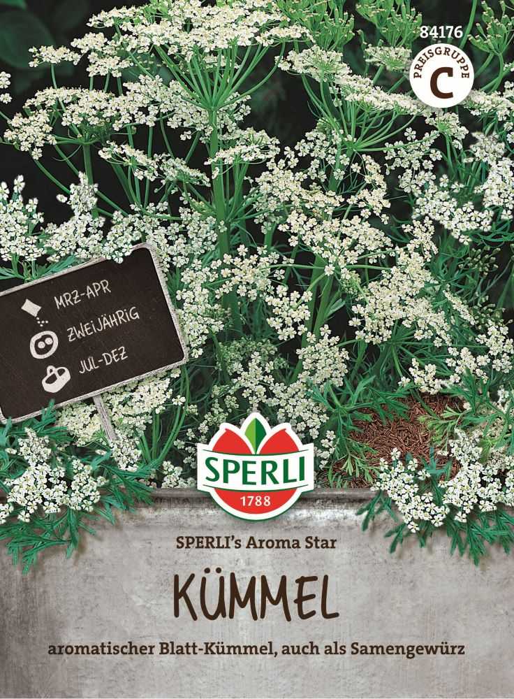 Ein zweijähriges Heil- und Würzkraut stellt der Kümmel 'SPERLI's Aroma Star' dar. Es kann vorkultiviert oder direkt im Freiland ausgesät werden, möglichst an einem sonnigen Platz mit einem tiefgründigen, humosen Boden ohne Staunässe. Im ersten Jahr wirst Du in den Genuss des leuchtend grünen Krautes kommen, welches stark an Möhrenkraut erinnert. Dieses kannst Du zum Abschmecken für Suppen, Salate und generell zum Verfeinern von Gemüse bestens verwenden.