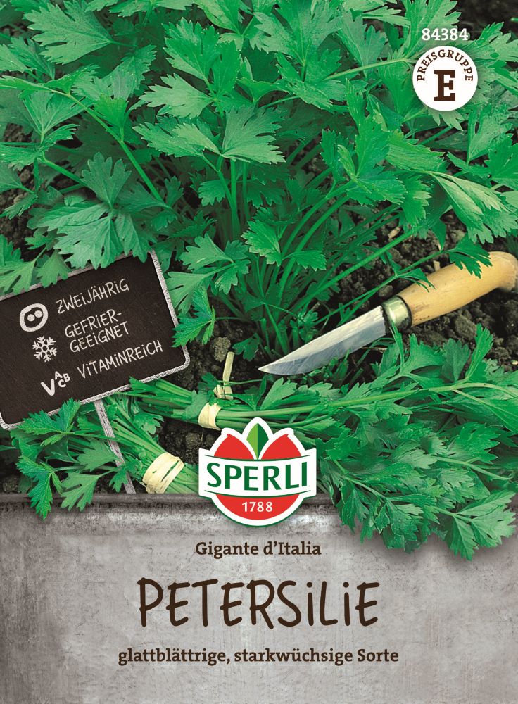 Eine sehr wüchsige Premiumsorte stellt die zweijährige Petersilie 'Gigante d'Italia' dar. Nach der Aussaat, die im Haus von Februar bis September im Freiland von März bis August möglich ist, bildet sie schnell sehr glatte, großflächige Blätter. Diese kannst Du im Zeitraum von Mai bis Oktober ernten und zum Würzen von Soßen, Suppen oder Salaten nutzen.