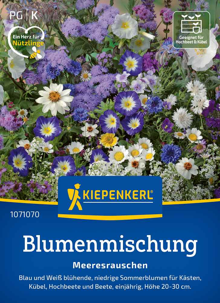 Die Blumenmischung Meeresrauschen in eleganten Blau- und Weißtönen sorgt für eine üppige Blüte in Kästen und Kübeln auf Terrasse und Balkon sowie im Beet oder als Weg- und Beeteinfassung. Die Blüten sind auch eine wertvolle Nahrungsquelle für Bienen und andere Nützlinge.
