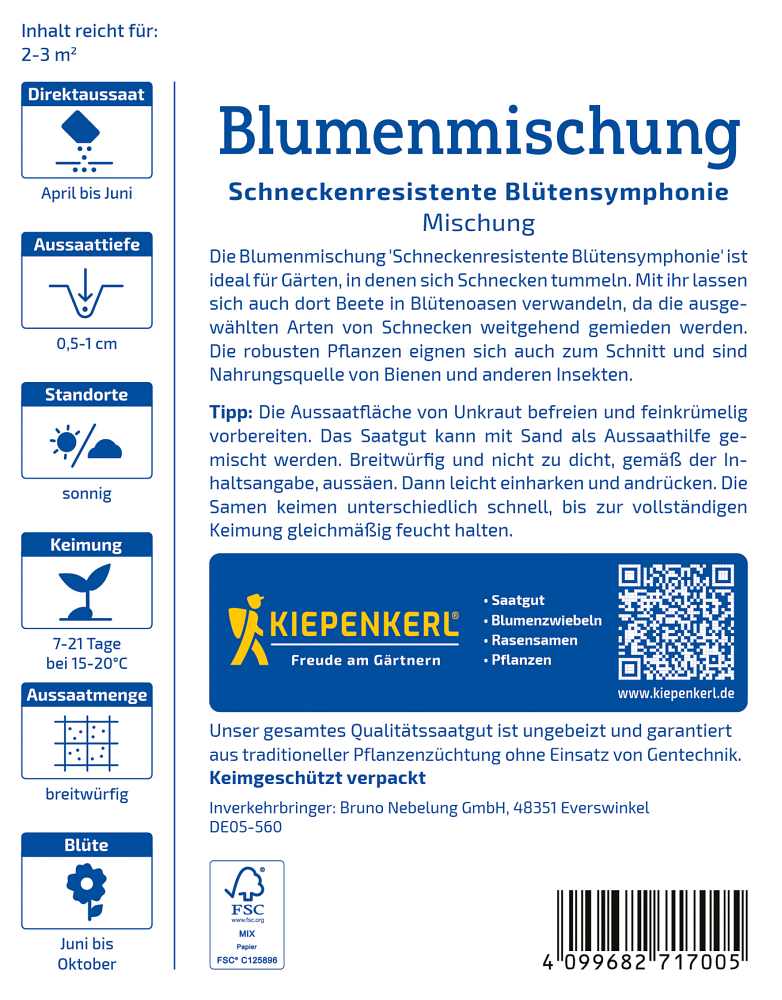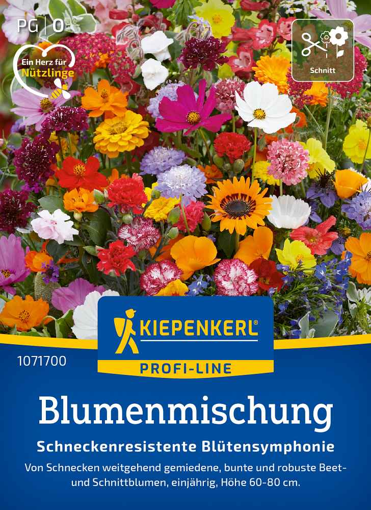 Die Blumenmischung Schneckenresistente Blütensymphonie ist ideal für Gärten, in denen sich Schnecken tummeln. Mit ihr lassen sich auch dort Beete in Blütenoasen verwandeln, da die ausgewählten Arten von Schnecken weitgehend gemieden werden. Die robusten Pflanzen eignen sich auch zum Schnitt und sind Nahrungsquelle von Bienen und anderen Insekten.