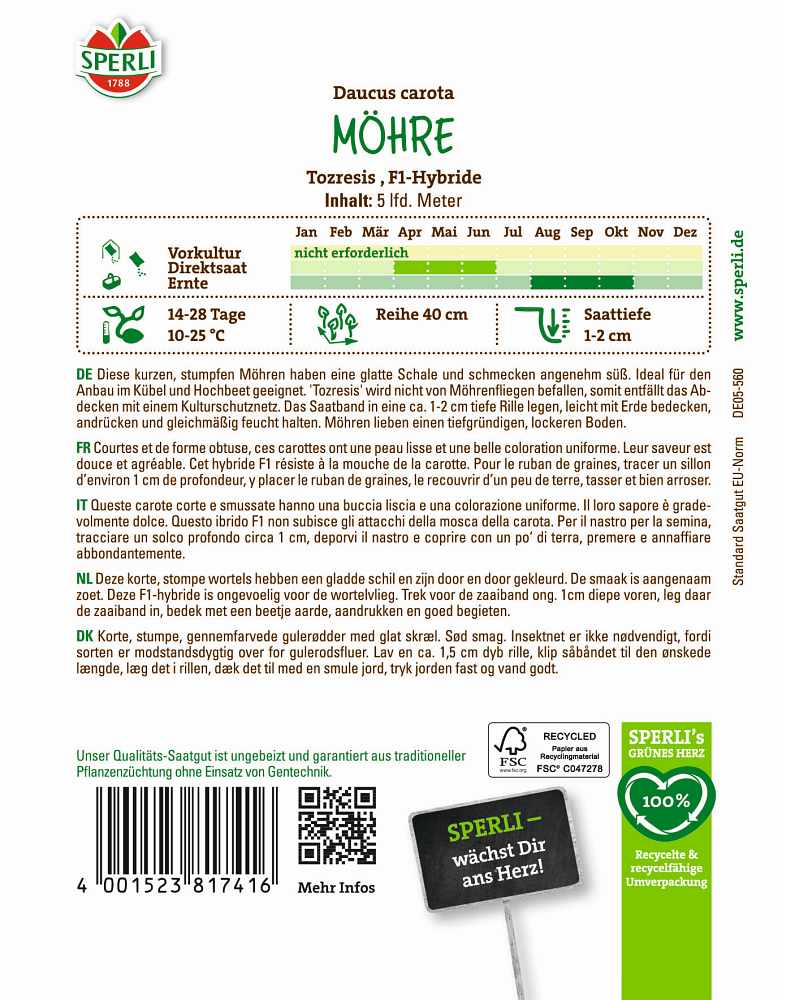 Einfacher geht es nicht: Mit dem praktischen Möhre Tozresis, Saatband ist die Aussaat so leicht wie nie zuvor! Das Saatband muss lediglich in eine etwa 1 cm tiefe Rille gelegt, mit ein wenig Erde bedeckt, angedrückt und angegossen werden. Eine mühevolle Aussaat ist nicht mehr notwendig und der richtige Pflanzabstand wird auch eingehalten. Die kurzen, stumpfen Möhren dieser Sorte haben eine glatte Schale und sind gut durchgefärbt.