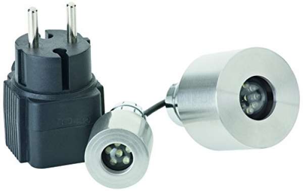 Produkteigenschaften 6 neutralweiße Leuchtdioden Geeignet für den Einsatz über und unter Wasser Schutzklasse IP 68 Hochwertige Edelstahlkappe, mit der die Wasserdurchflussmenge reguliert werden kann Durchmesser 30 mm Halbstreuwinkel der LED: 30° Inkl. Niedervolt-Steckertrafo Einfache Installation durch den innovativen Schlauchverbinder. Technische Daten: