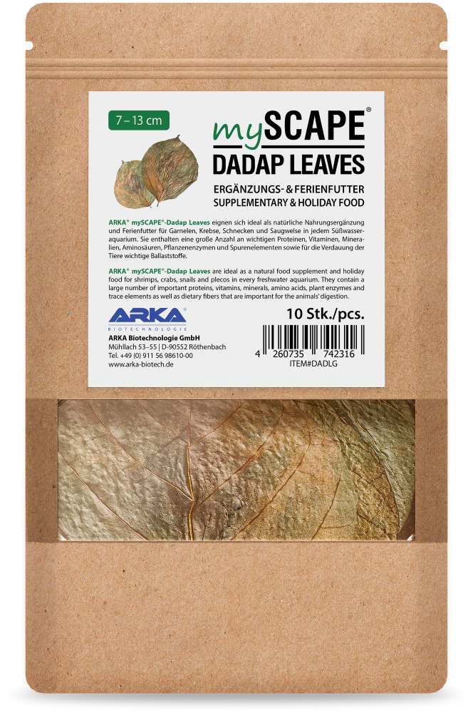 ARKA mySCAPE-Dadap Leaves eignen sich ideal als natürliche Nahrungsergänzung und Ferienfutter für Garnelen, Krebse, Schnecken und Saugwelse in jedem Süßwasseraquarium. Sie enthalten eine große Anzahl an wichtigen Proteinen, Vitaminen, Mineralien, Aminosäuren, Pflanzenenzymen und Spurenelementen sowie für die Verdauung der Tiere wichtige Ballaststoffe.