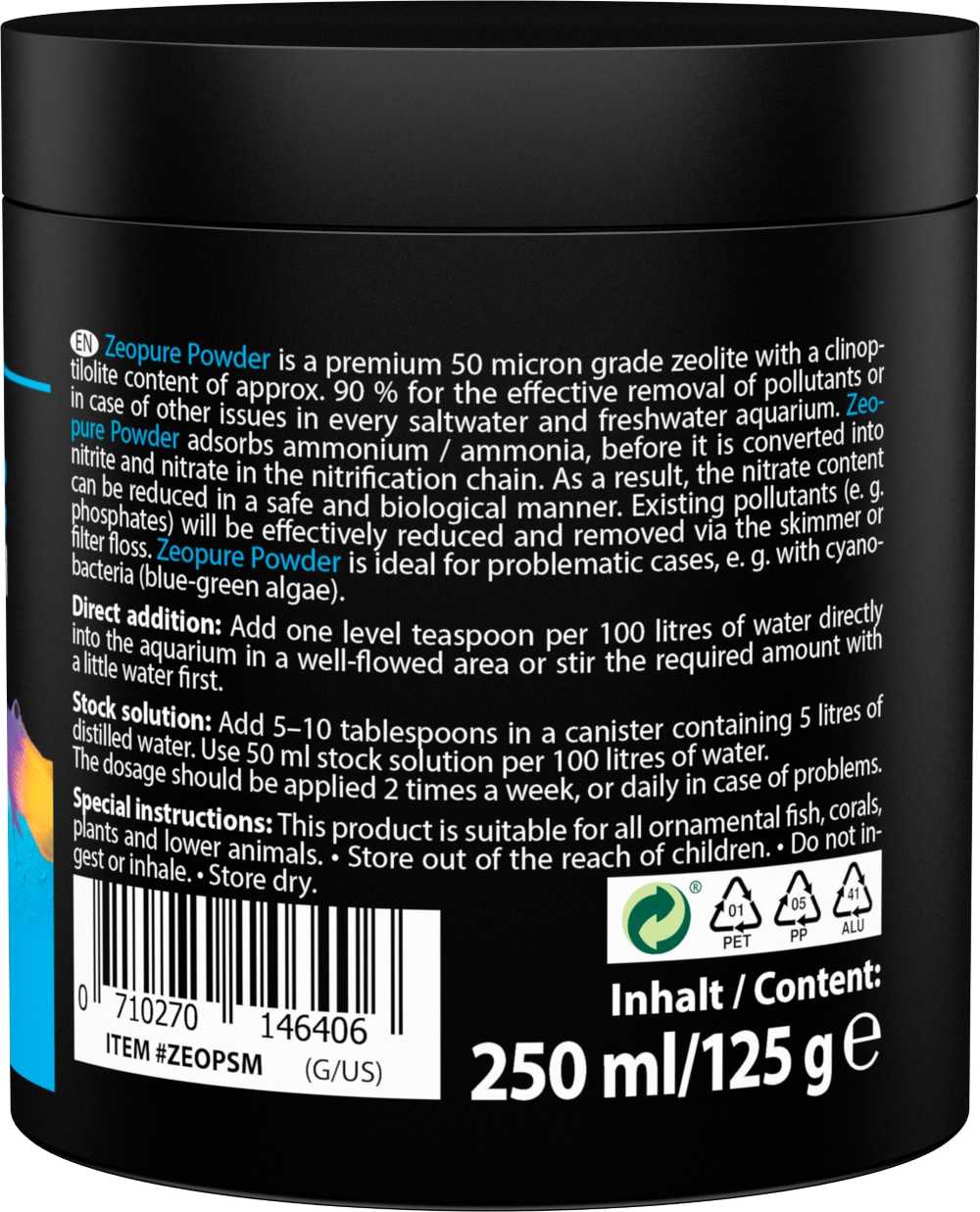 Zeopure Powder ist ein Premium-Zeolith mit einer Körnung von 50 Micron und einem Klinoptilolithgehalt von ca. 90 % zur effektiven Entfernung von Schadstoffen oder bei Problemfällen in allen Meer- und Süßwasseraquarien.