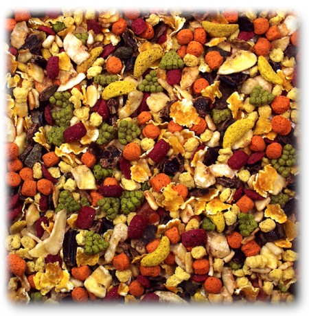 - Zusammensetzung: extrudiertes Mais- und Reismehl, Bananen 22%, Maisflocken, Johannisbrot, Ananas 7,2%, Aprikosen 4,8 %, Rote Beete 2%