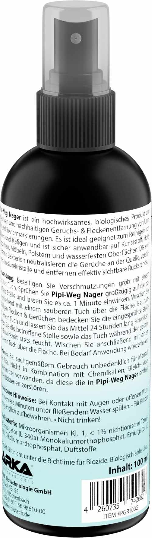 Hinweis: Bei sachgemäßem Gebrauch unbedenklich für Mensch und Tier. Nicht in Kombination mit Chemikalien, Bleich- oder Waschmittel verwenden, da diese die in Pipi-Weg Nager enthaltenen Bakterien zerstören.