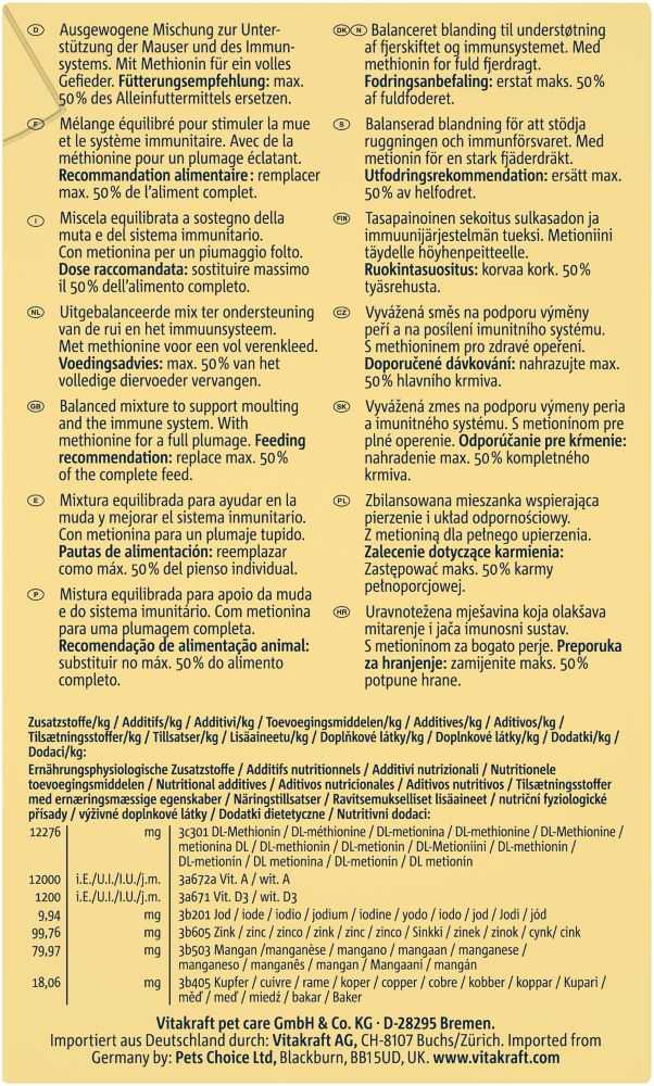 Zusatzstoffe pro kg: Ernährungsphysiologische Zusatzstoffe: 3c301 DL-Methionin 12.276,00mg, 3a672a Vitamin A 12.000,00IE, 3a671 Vitamin D3 1.200,00IE, 3b201 Jod 9,94mg, 3b605 Zink 99,76mg, 3b503 Mangan 79,97mg, 3b405 Kupfer 18,06mg
