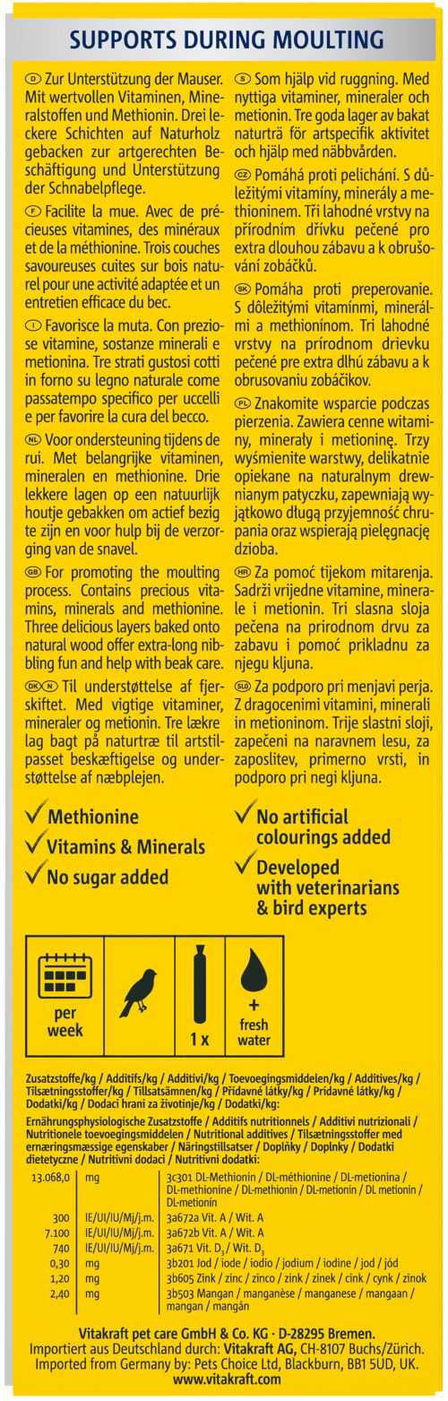 - Mit wertvollen Vitaminen, Mineralstoffen und der essentiellen Aminosäure Methionin zur Unterstützung bei der Mauser