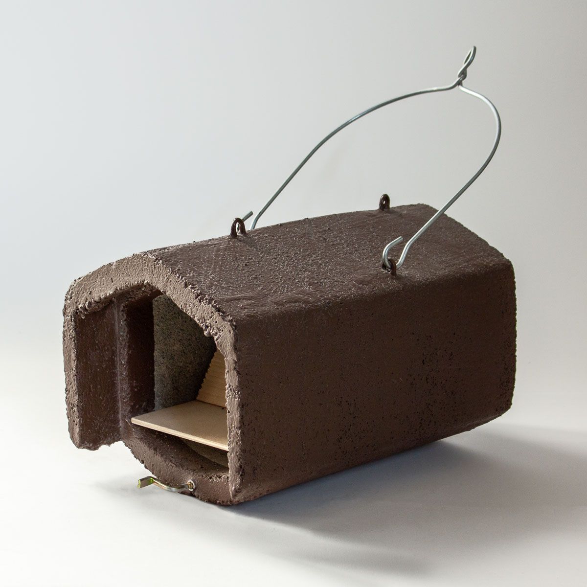 Durch einen speziellen vorgezogenen Vorbau kann dieser Typ ebenso frei, aber auch an Hausfassaden, aufgehängt werden. Diese Halbhöhle hat zusätzlich einen Brutraumeinsatz, welcher zu Kontroll- und Reinigungszwecken herausgenommen werden kann. Selbst an dunklen Hangplätzen erfolgt durch die Einflugöffnung ein guter Lichteinfall und sie wird sehr gerne angenommen.
